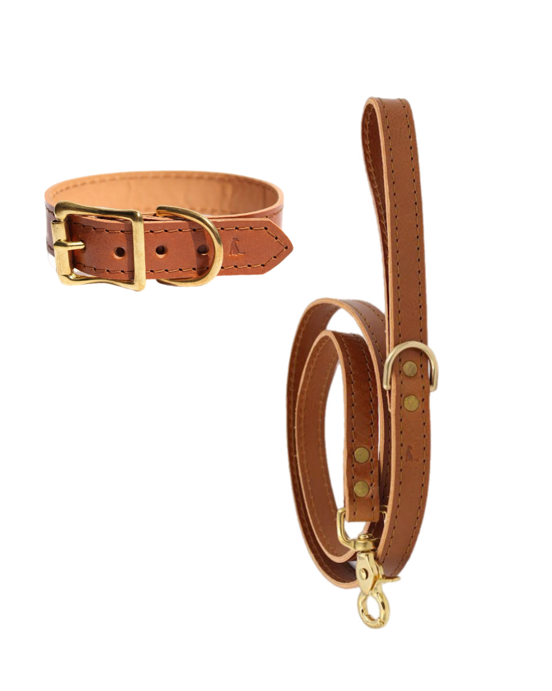 Crafted from smooth, buttery caramel leather, both the dog collar and leash feature gleaming golden brass hardware for a refined, sophisticated look.